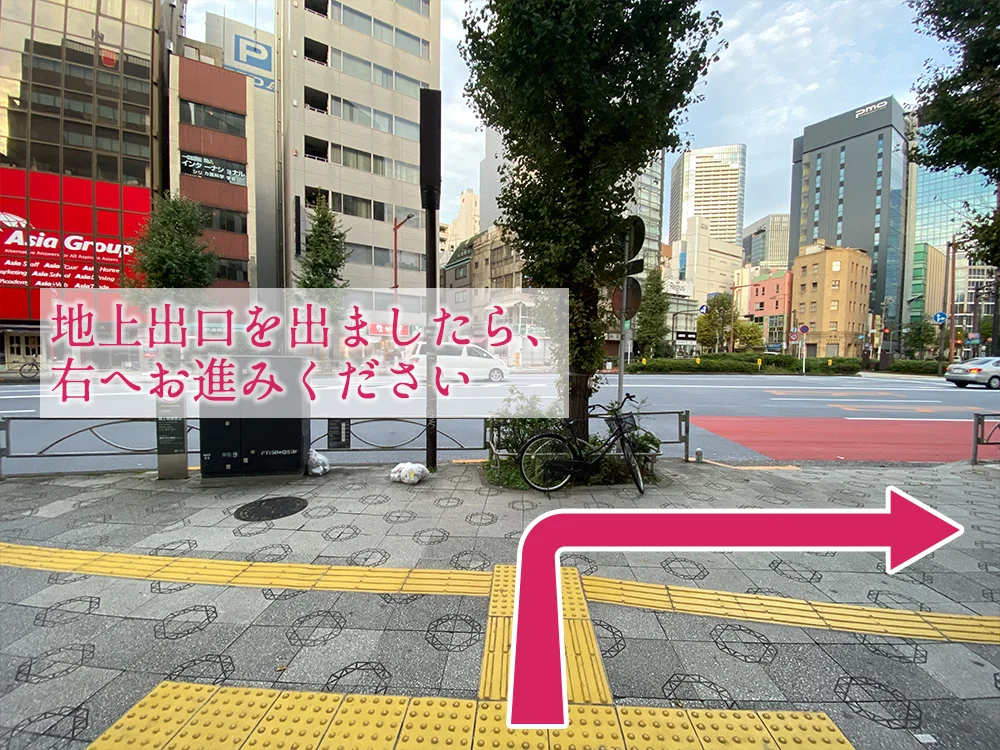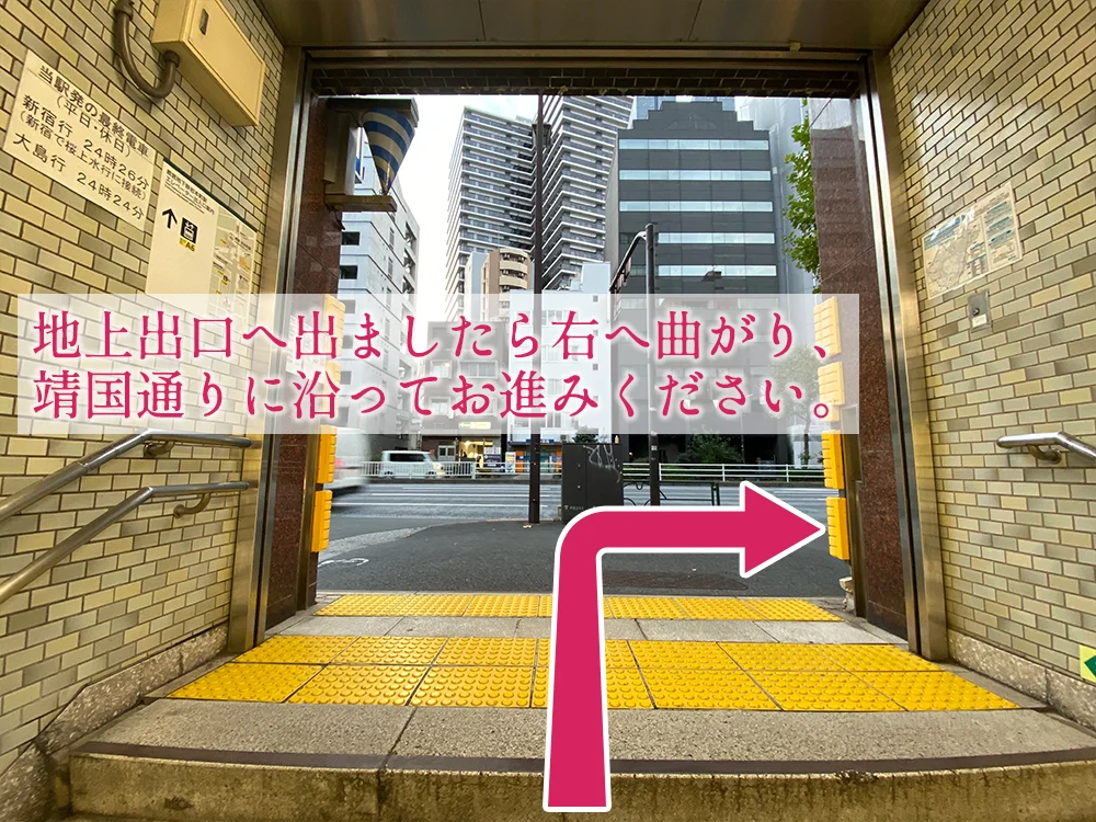地上出口を出ましたら、右へお進みください。