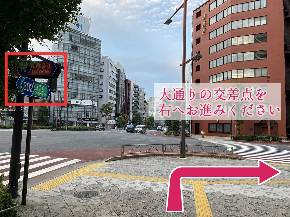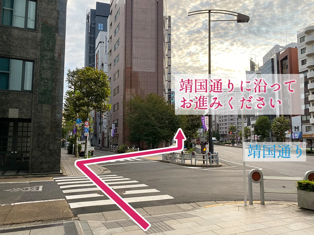 右手に見える靖国通りに沿ってお進みください。