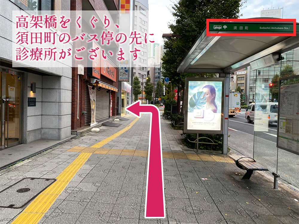 以下の説明における写真には、当院の名称変更前の「秋葉原中央通診療所」と掲示されたものが使用されておりますが、場所や経路に変更はございません。