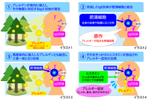 ①アレルギーの原因物質(以下アレルゲンと記載)が体内に侵入すると、即座にそのアレルゲンに対応したIgE抗体が血液の中で産生されます。(イラスト1)