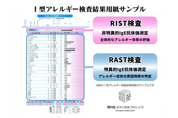 血液中のIgE抗体の総量を測定する検査で、アレルゲンの種類を問わず、患者様が、過去数年間でどれくらいアレルギーを起こし、かつ、今後アレルギーを起こす可能性がどの程度あるのかを示します。数値が高いほどアレルギー体質が強い、ということになりますが、必ずしも数値と症状は比例しない点に注意が必要です。この数値は極めて重要で、医師が患者様の薬を選定する際、薬の力価(強さ)を決定する根拠となります。重症の患者様には定期的に検査を行い、この数値の推移を追うことで治療効果を判定します。アレルギー検査を実施しても、医療機関によっては、この項目を測定していない例が散見されるので注意が必要です。