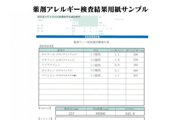 たとえば、複数の医薬品が処方され、その服用後しばらくして薬疹が発生した場合、処方された医薬品の現物(銘柄も容量も同じもの)のすべてを用意してこの検査を実施することで、原因となる内服薬を特定することができます。さらに、特定の鎮痛薬や抗菌薬などに対してあらかじめ検査を行うことにより、ご自身がその薬剤を使用可能かどうかの判定を行うことも可能となり、ご自身の体質を事前に把握することもできます。