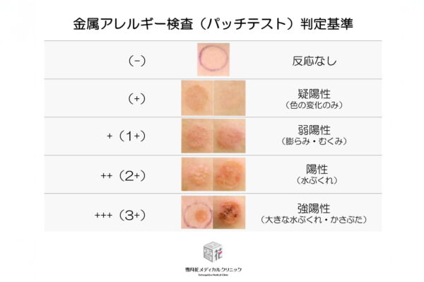 一般的な金属製品の多くは、複数の種類の金属を混合して生成されており、例えばステンレスは、鉄とクロムの合金です。またメッキ製品の表面にも、ニッケル、亜鉛、銅など、多くの種類の金属が含まれています。金属アレルギー検査は、金属製品を身に着けて発疹が出現した場合などに、患者様がどの種類の金属に対してアレルギーがあるかを判定するために行われます。この結果によって、身に着けてはいけない金属の種類がわかるほか、矯正やインプラント、補綴など、歯科治療の前に行うことで、歯科材料による金属アレルギーを未然に防ぐことができます。