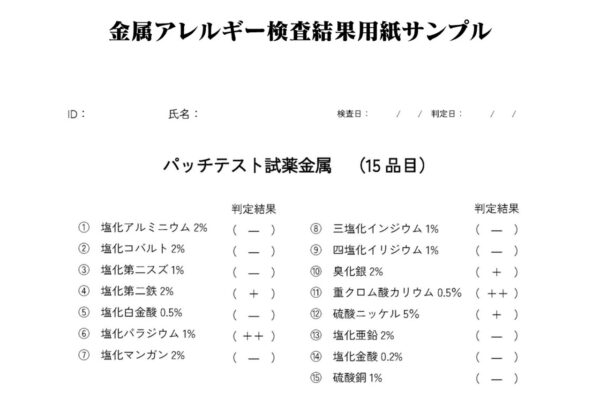 金属アレルギー検査は、皮膚や粘膜における金属の接触による症状が出現した際に実施すべき検査です。単一の金属の成分が含まれた試薬シール(パッチ)を、複数種類同時に皮膚表面に貼付し、48時間後の皮膚の状態を判定することにより行います。さまざまな種類の金属に対するアレルギーの有無と、その強弱の評価が可能です。