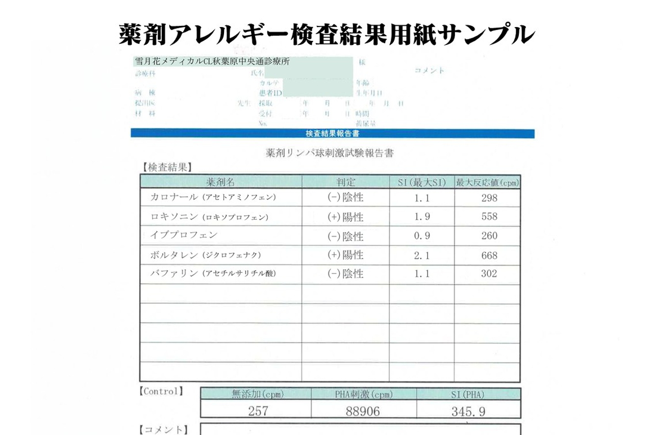 検査結果では、検査対象となる薬剤に対する患者様のアレルギーの程度が定量的に表示され、その薬剤を安全に使用可能などうかの判断が可能です。たとえば、複数の医薬品や化粧品の使用後しばらくして薬疹が発生した場合、この検査を行うことで原因を特定することができます。さらに、使用する予定のある医薬品や化学物質に対して、この検査をあらかじめ行うことにより、ご自身の体質を事前に把握しておくことができます。