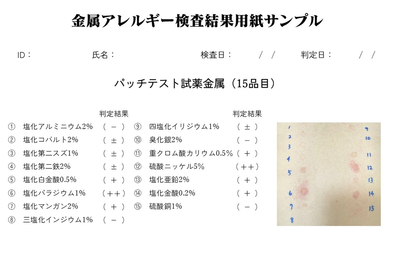 当院では、健康保険適用の安価な全般検査用の試薬ではなく、歯科からの依頼にも対応可能な、金属に特化した専用の試薬を用いており、イラストに提示された15種類の金属に対する判定を行うことができます。そのため、金属アレルギー検査は症状の有無に関わらず、すべて自由診療にて行っております。検査費用は、検査対象となる金属の種類や数により異なるため、事前にお見積りをさせていただきますのでお問合せください。(参考価格:税込5,500円~44,000円)